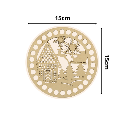 Korbboden rund Ø 15 cm – Winterlandschaft mit Haus & Schlitten, gelocht, graviert
