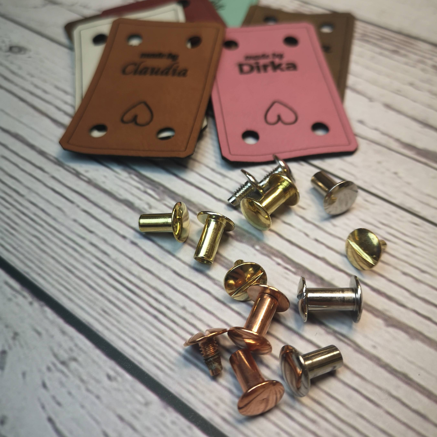 40×60 mm – Personalisierte Labels mit Schrauben (Chicago‑Screws), Kunstleder | große Branding‑Plakette für Handmade
