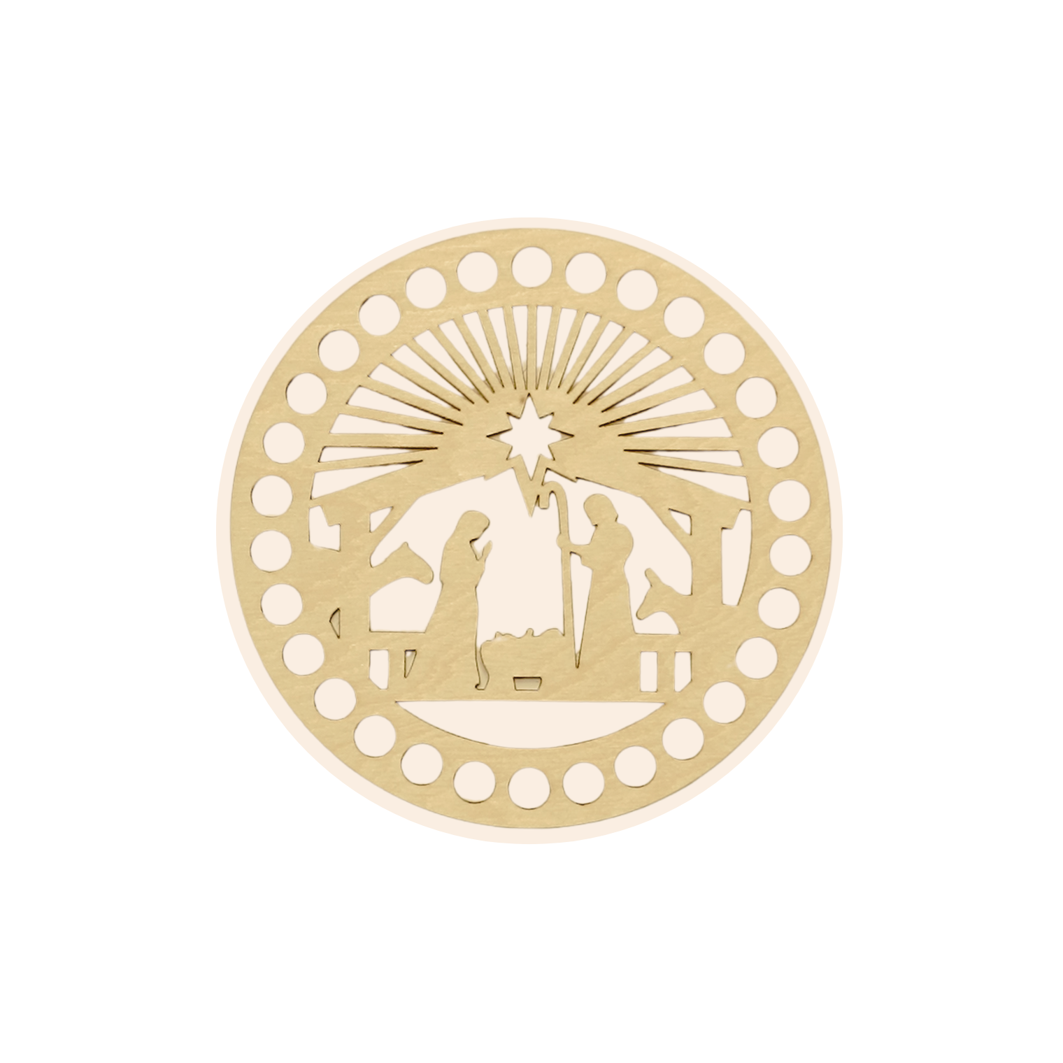 Krippe/Heilige Familie mit strahlenförmigem Hintergrund – ein traditionelles Motiv für festliche Körbchen zu Advent und Weihnachten. Harmoniert besonders mit hellen und natürlichen Kordeln.