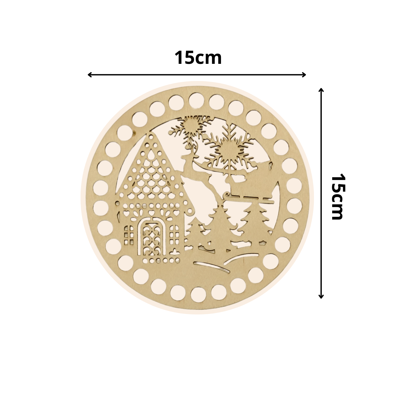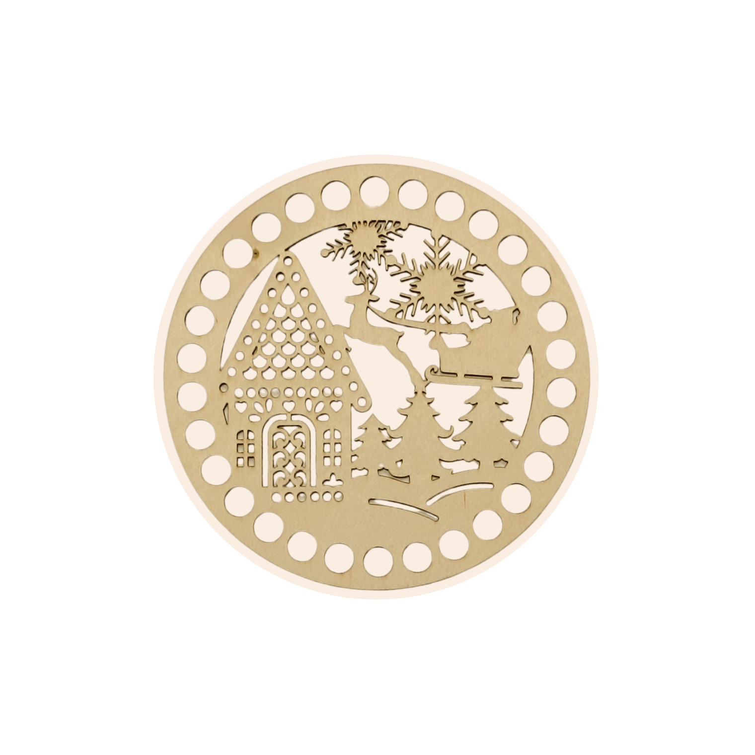 Winterliche Szene mit Haus & Schlitten – stimmungsvoller Klassiker für Körbchen mit Kerzen, Süßigkeiten oder kleine Geschenke. 10‑mm‑Ösen erleichtern gleichmäßiges Häkeln, die Gravur setzt einen feinen Akzent.